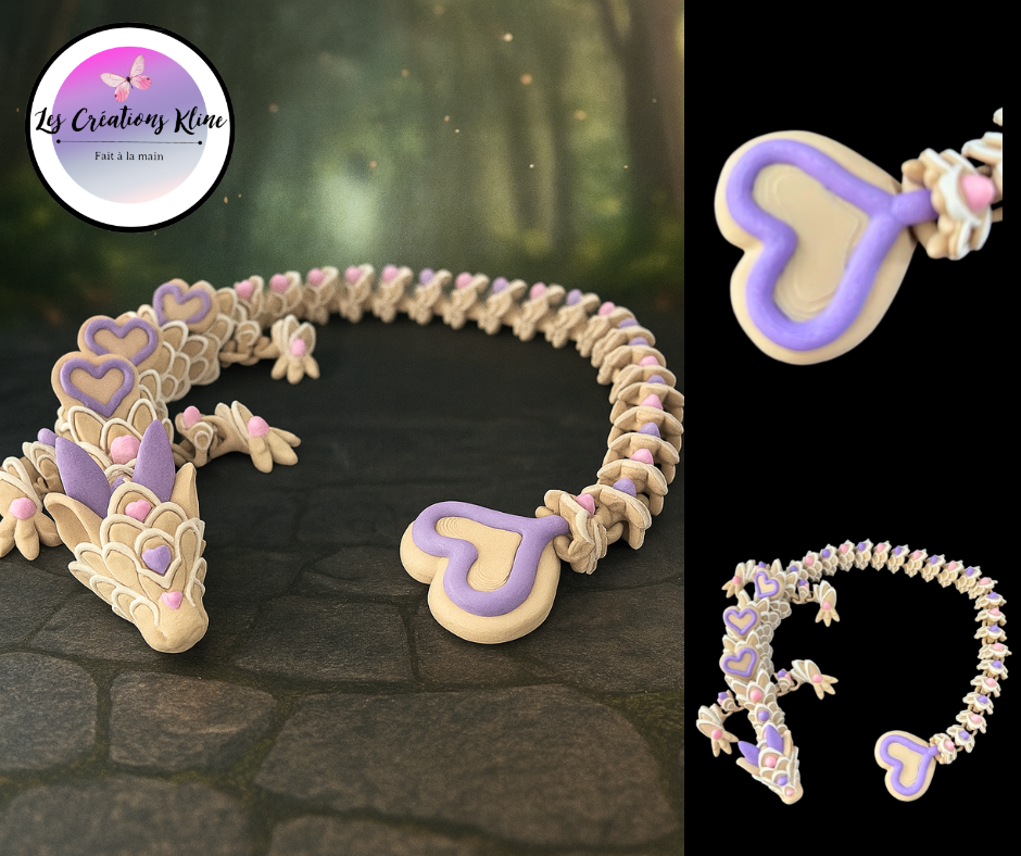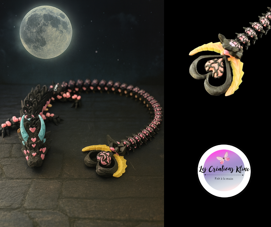 Ce dragon imprimé en 3D est plein de charme et de détails. Sa queue en cœur lui donne une touche douce et spéciale tout en gardant son côté mystique. 🪄✨
